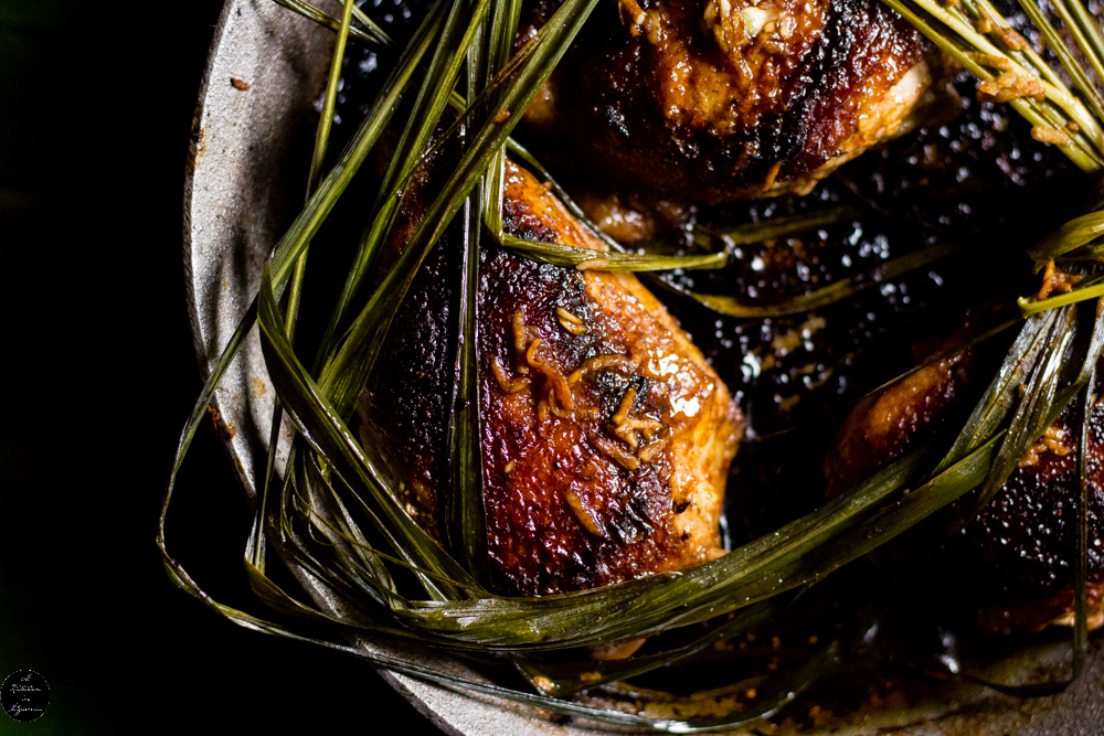 In a bowl, combine the grated lemongrass root, garlic, black pepper, ground chili, paprika, chili oil, orange juice, soy sauce and salt. Mix well. Add the chicken and mix well. Let the chicken marinate overnight or for at least 2-3 hours if you are in a hurry.